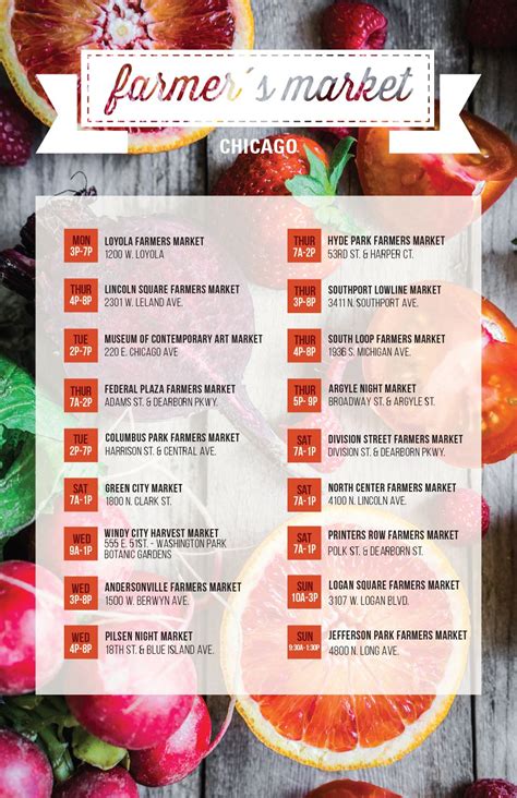The Chicago Farmers Market Network represents numerous markets across the city. Explore their website for a comprehensive list of markets and their vendor information.